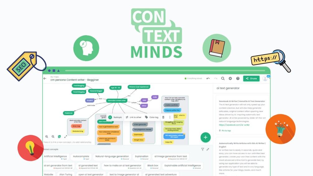 ContextMinds helps you visually organize your content ideas and AI-generated keyword suggestions.